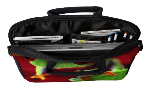 The 13-Inch Frog Executive Laptop Sleeve is a fun yet functional way to protect your laptop computer. This laptop bag is composed of lightweight, high grade, neoprene rubber that cushions your laptop for maximum moisture, shock and scratch protection. The Executive laptop case has a zippered external pocket that allows you to keep power codes, USB and other accessories safely away from your laptop, eliminating the chance of scratching the front of the tablet or laptop. And, since the pocket is zippered, you won't have to worry about losing these valuable items. In addition, the Executive Sleeve offers a detachable, padded "non-slip" shoulder strap with padded handles to make carrying your laptop easy. Designer Sleeves utilizes a patented process called SublipreneTM for manufacturing. This patented process allows us to print this stylish design in rich, full color graphics with very high levels of detail. The Frog laptop sleeve will never crack or peel as silk-screened ink does. In addition, the ink is created with UV inhibitors virtually eliminating product fading.